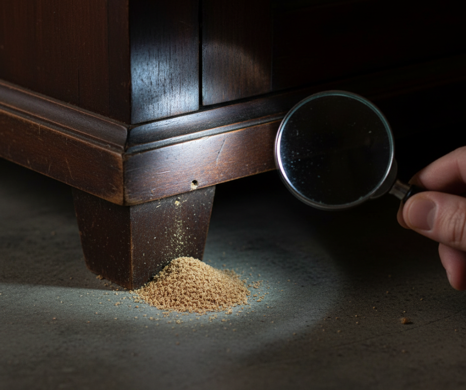 Frass biasanya terkumpul di bawah perabot, di dalam laci, di penjuru bingkai pintu, atau di sepanjang kaki meja. Kadangkala, ia boleh dilihat menonjol keluar dari lubang-lubang kecil di permukaan kayu. - Tiada Bau, Tetapi Konsisten Muncul: