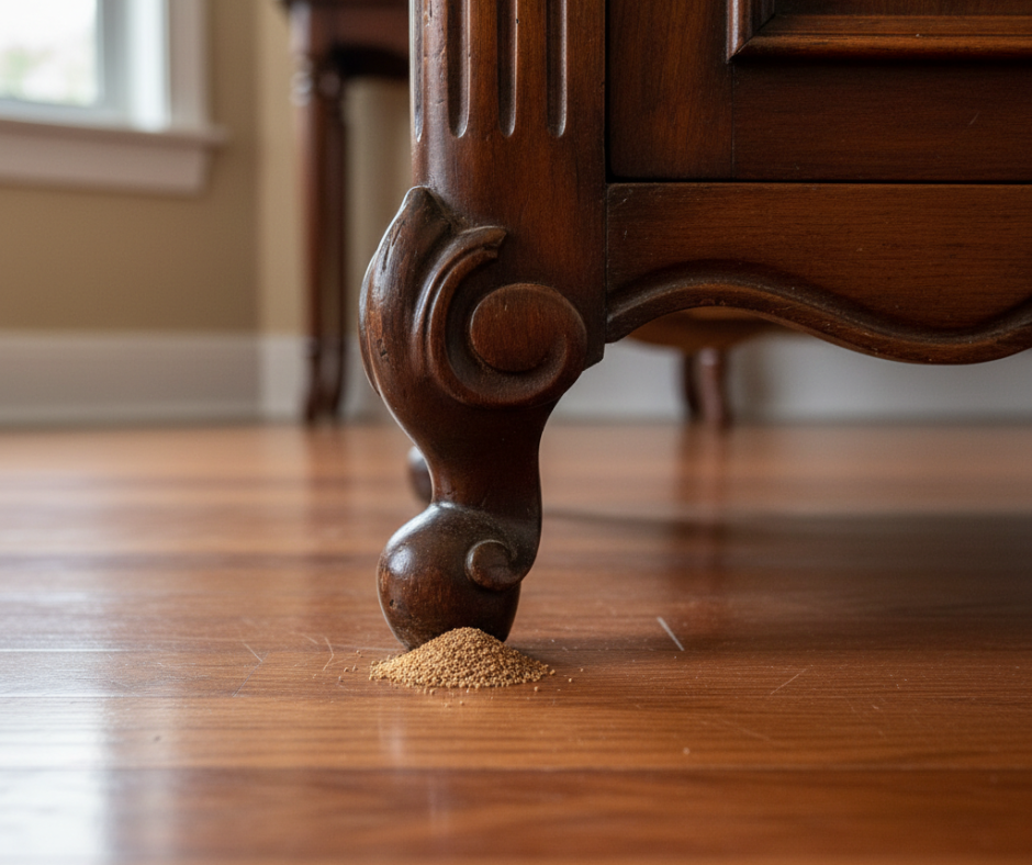 Ini adalah tanda paling klasik. Frass ialah najis anai-anai kayu kering — kecil, kering, dan berbentuk seperti butiran kayu halus. Ia biasanya terkumpul di bawah perabot, di atas lantai, atau di celah rak.